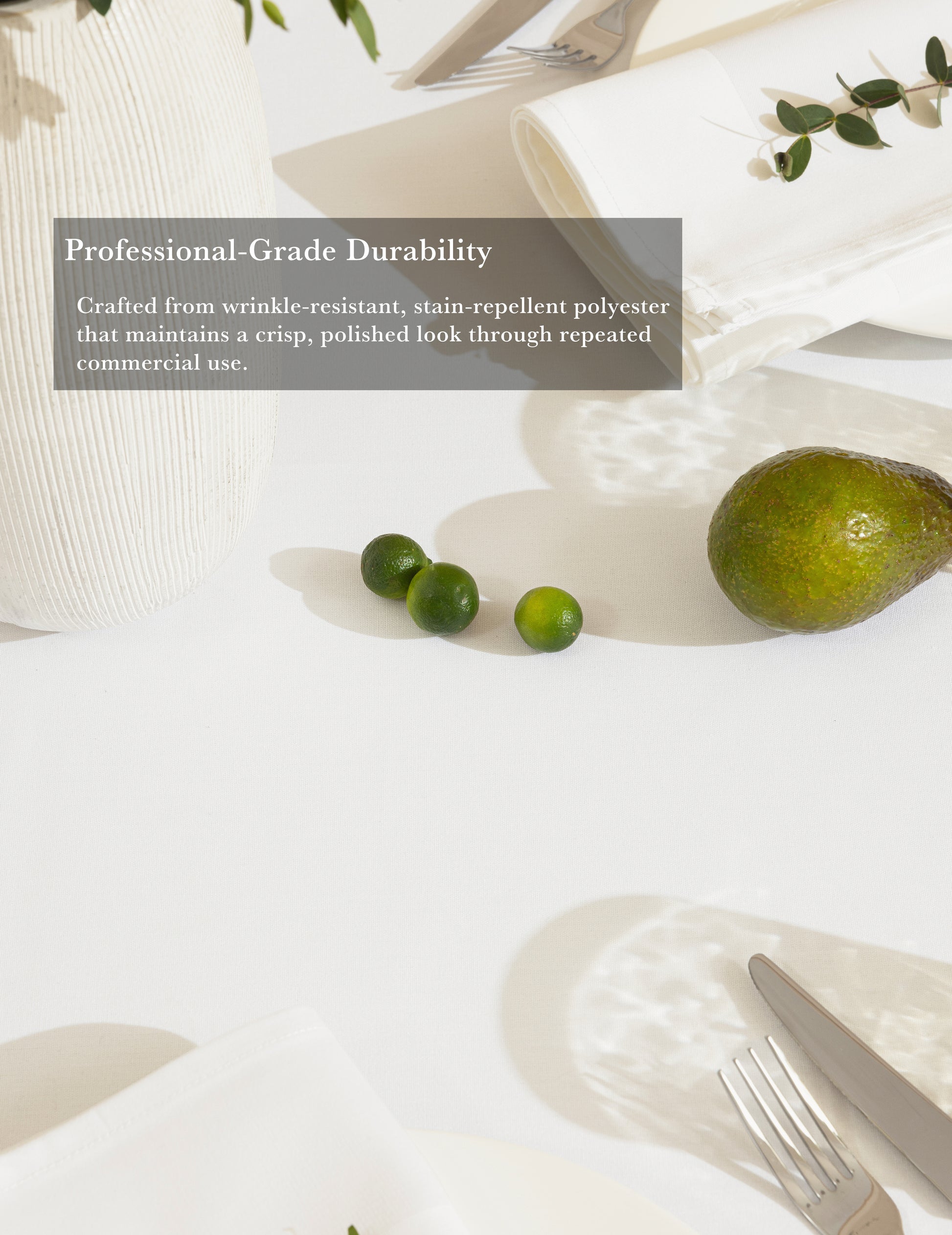 Made from 100% polyester, these tablecloths resist wrinkles, stains, and fading, ensuring a clean and professional look with minimal maintenance.