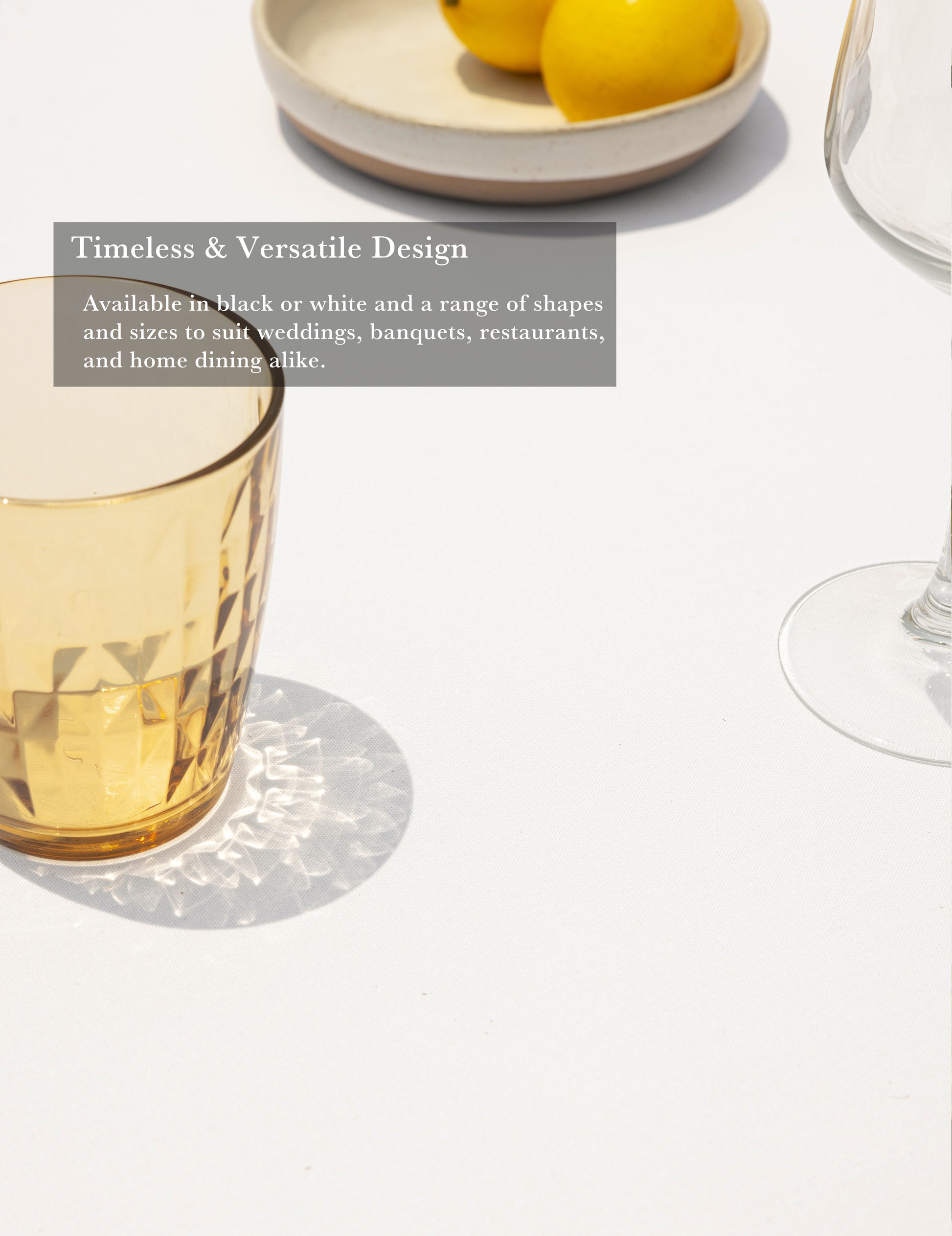 Available in square, rectangular, and round options, with classic black or white to suit weddings, banquets, corporate events, or daily service.