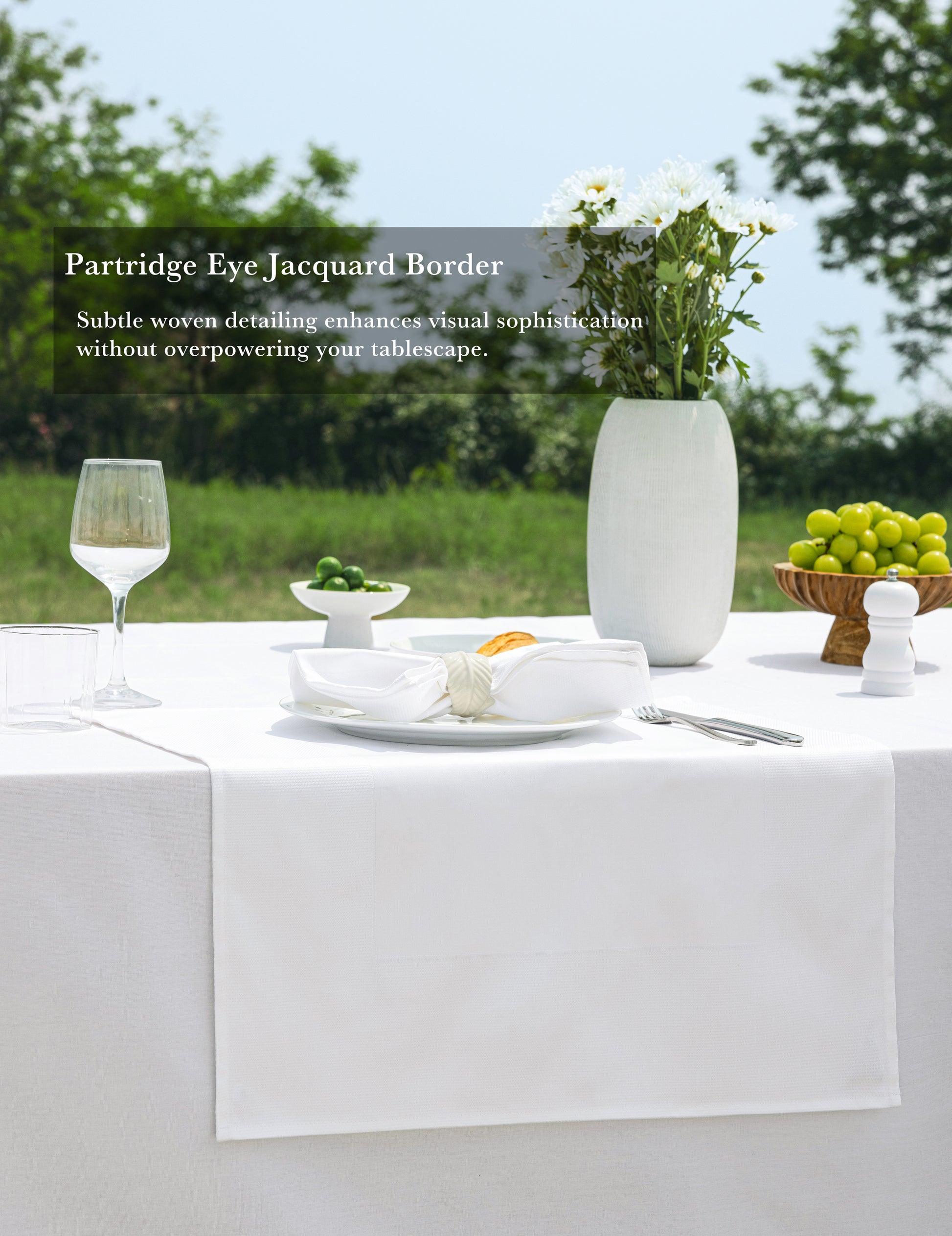 Woven from 100% premium cotton, these napkins offer a soft hand feel with breathable comfort. The partridge eye jacquard border adds subtle texture and sophistication, elevating any dining setup. Sized 22"x22", they provide ample coverage for folding, layering, or polished place settings.