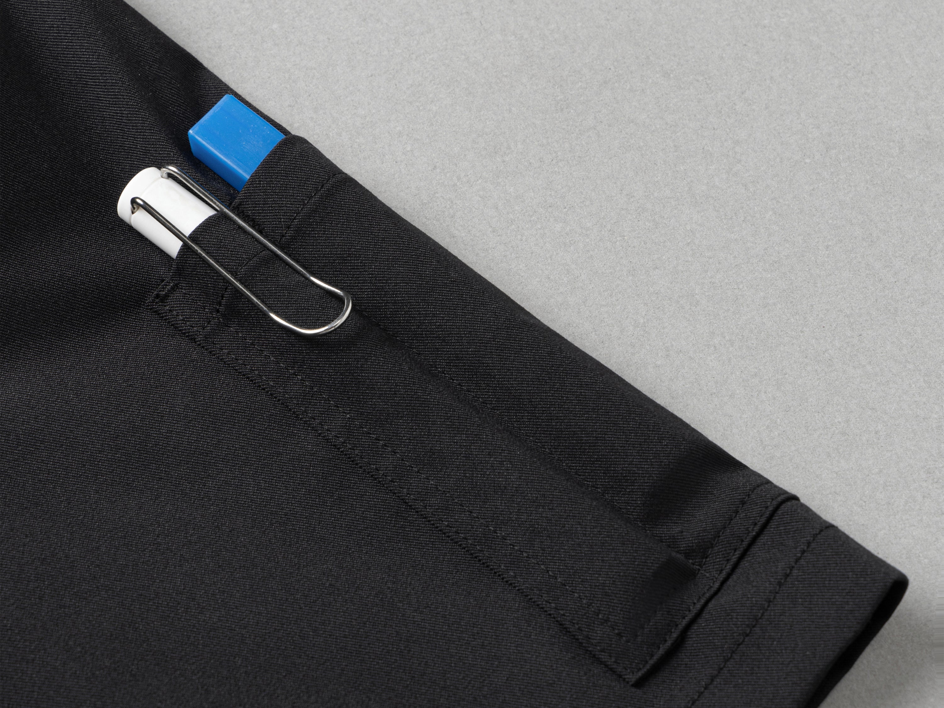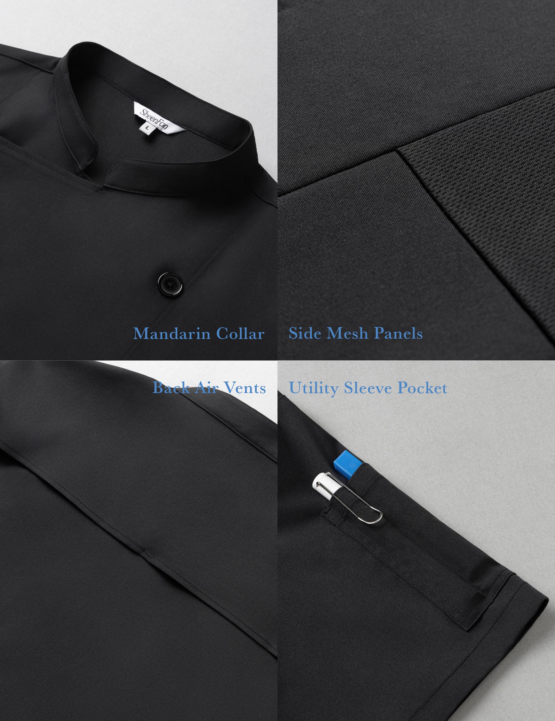 The modern mandarin collar adds a clean, professional edge, while the utility sleeve pocket with compartments for a pen and thermometer keeps your tools close at hand.